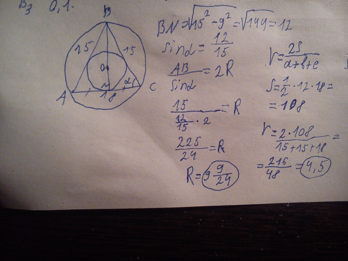 Основание равнобедренного треугольника равно ,18 см, а боковая сторона равна 15 см. Найдите радиусы вписанной в треугольник и описанной около треугольника окружностей.