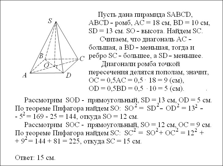 основание пирамиды ромб с диагоналями 10 и 18. Высота пирамиды проходит через точку пересечения диагоналей ромба. Меньшее боковое ребро пирамиды равно 13 см. Найдите большее боковое ребро пирамиды