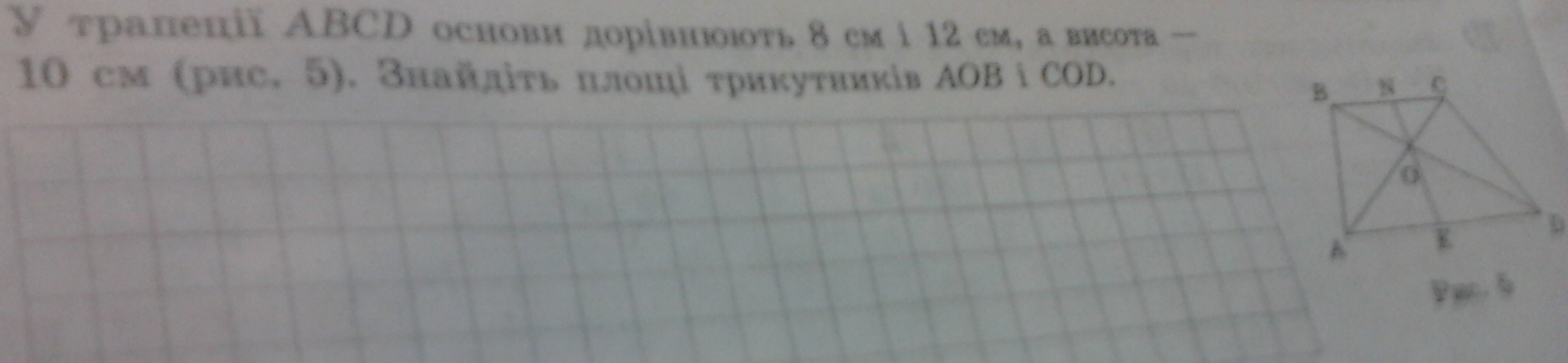 3.тр-ки АОВ и СОД равновеликие, сумма их площади равна площадь трапеции - площадь ВОС-площадь АОД. ВОС подобен АОД с коэф. подобия 8:12=2/3