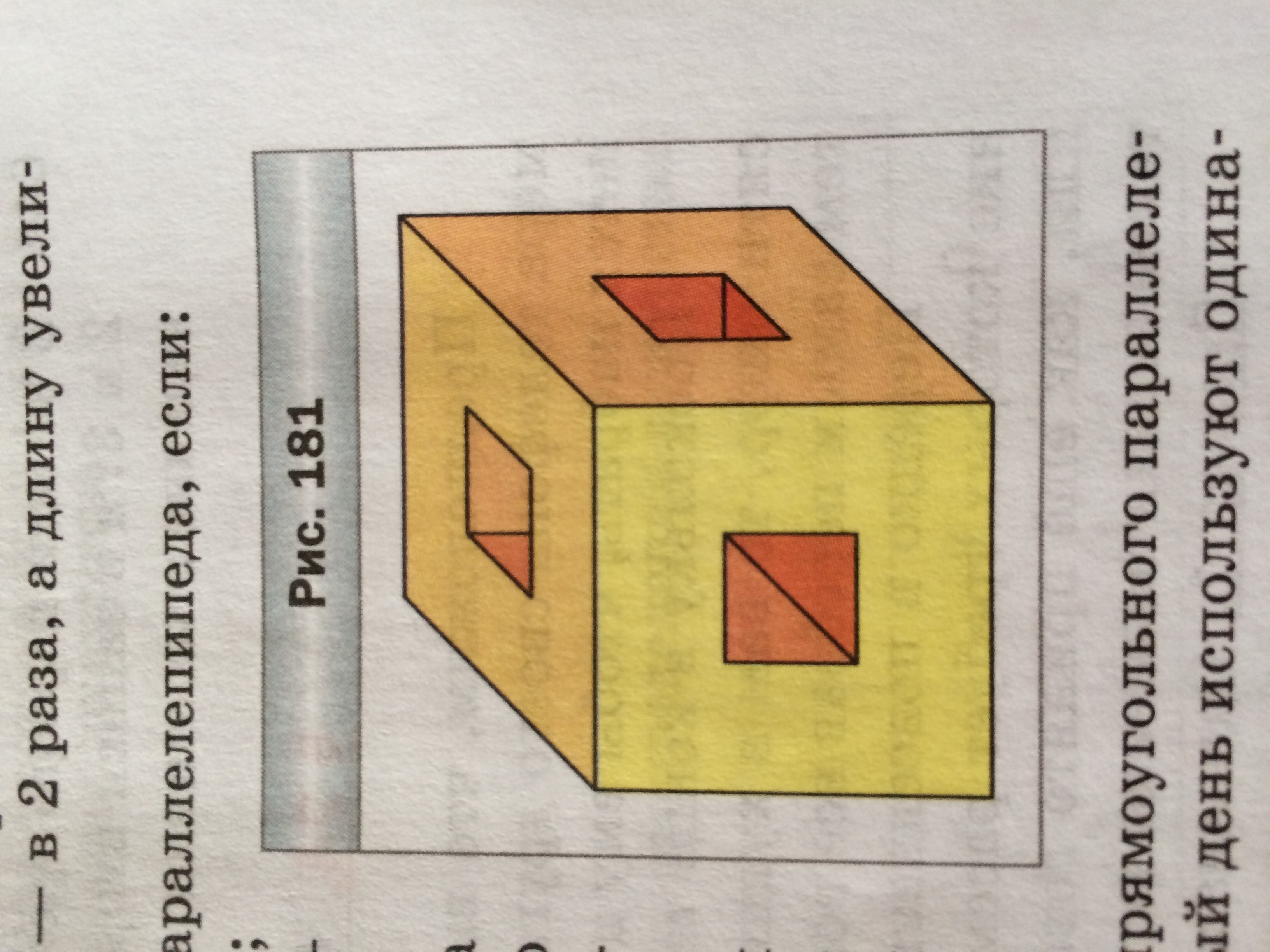 В кубе с ребром 3 см проделали три сквозных квадратных отверстия со стороной 1 см (рис. 181). Найдите объём оставшейся части?