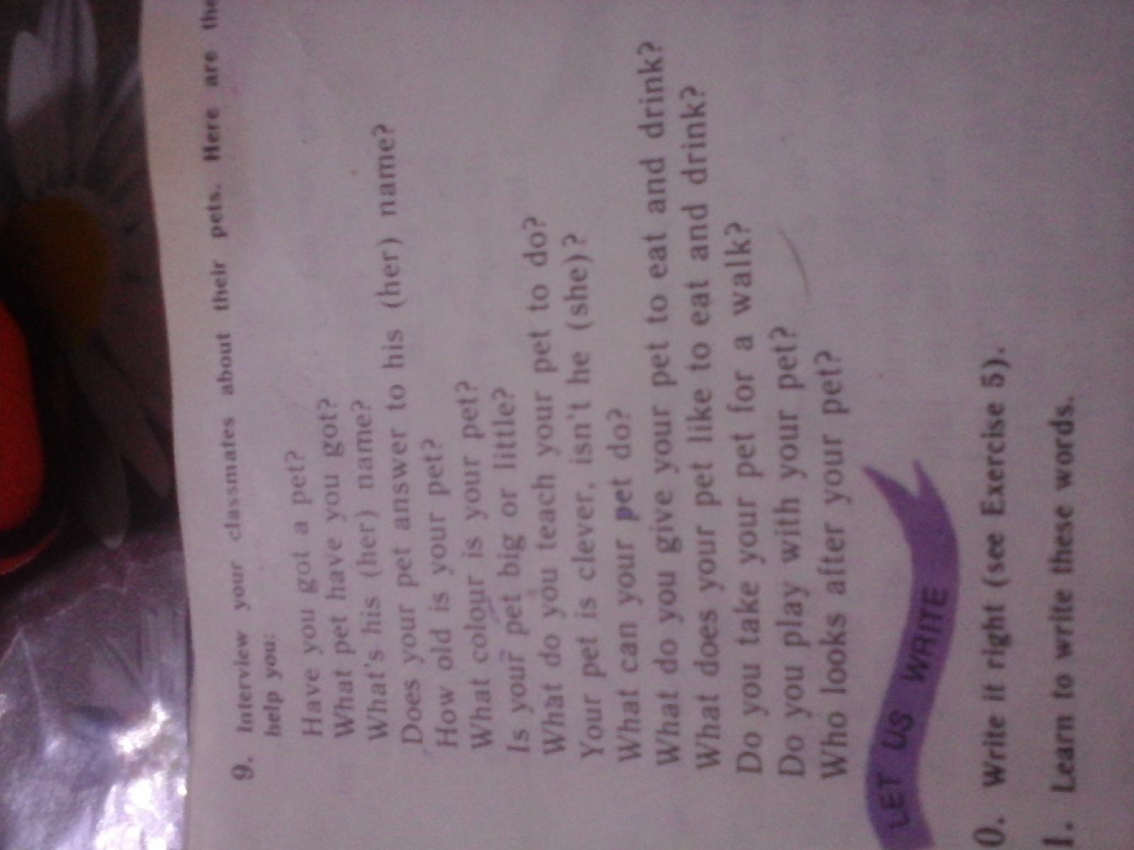 1. Yes I have. 2. I have (собака, кошка, хомяк и так далее) 3.His/her name - ... 4.Yes he does/No he doesn't. 5.He/she ... years old. 6. White/yellow/black/brown. 7.He/she is big/little. 8. Jump, stand on back legs. 9. He/she clever/stupid. 10. Chase to ball/lazer. 11. Water and feed. 12. Yes I do/No I don't. 13. Yes I do/No I don't. 14. I and father/mother.