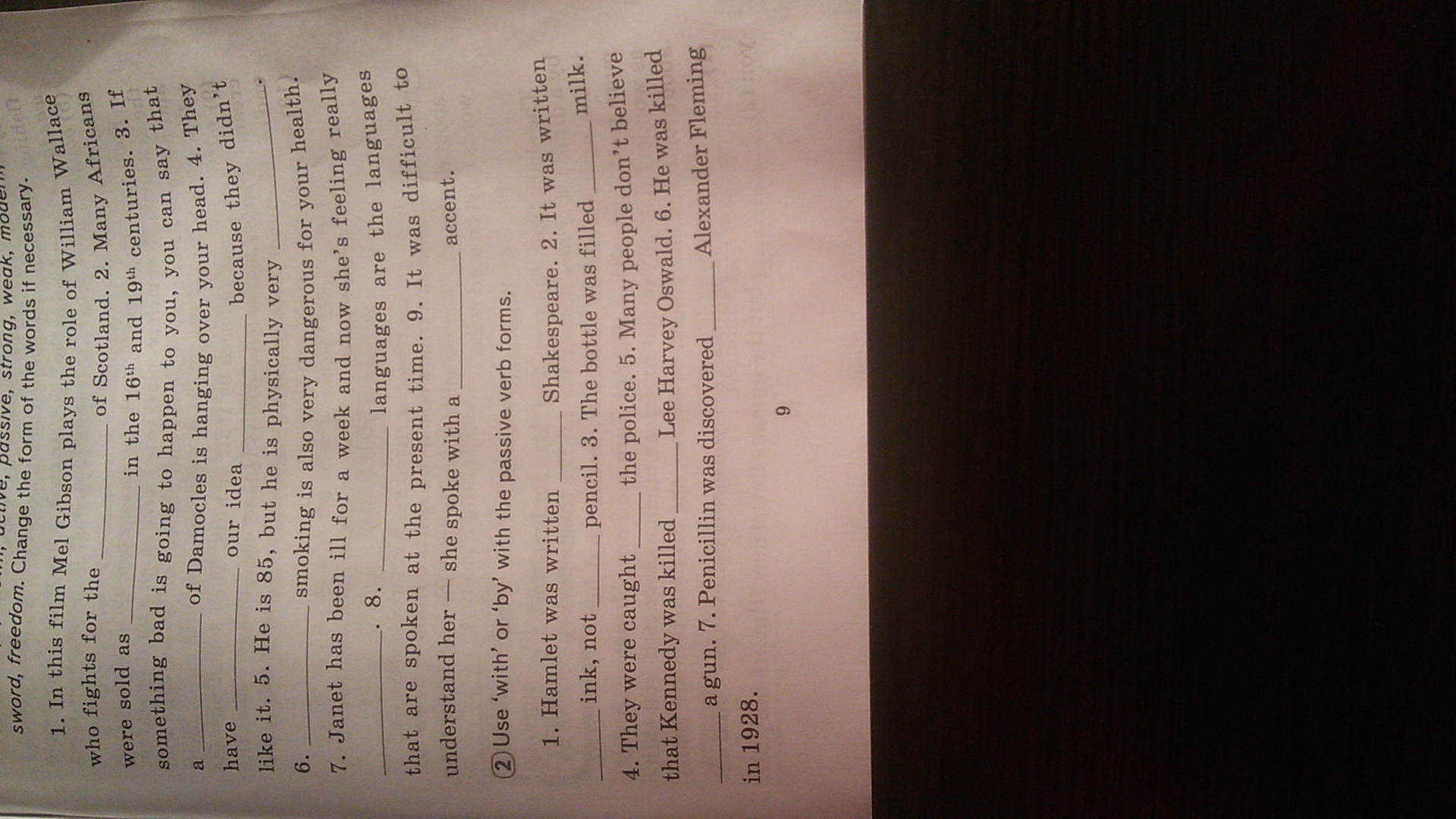 1. Hamlet was written by Shakespeare. 2.It was written with ink, not with pencil. 3. The bottle was filled with milk.4. They were caught by the police. 5. Many people don't believe that Kennedy was killed by Lee Harvey Oswald. 6. He was killed with a gun.7. Penicillin was discovered by Alexsander Flenming in 1928.