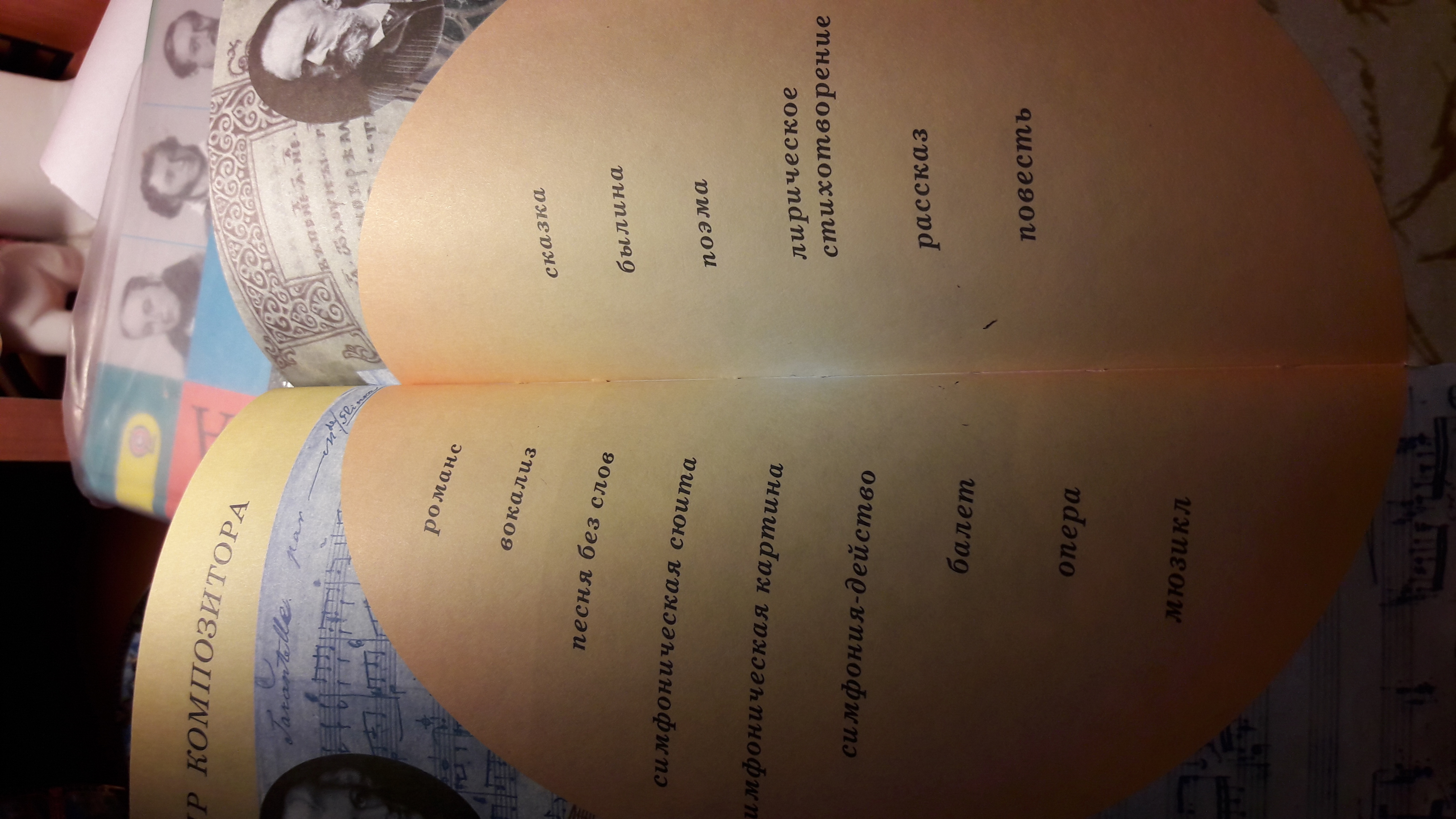 Даны жанры музыки и литературы. Нужно соединить жанры музыки и литературы, схожие между собой (если нет, не соединять). И написать к каждому пример произведний.