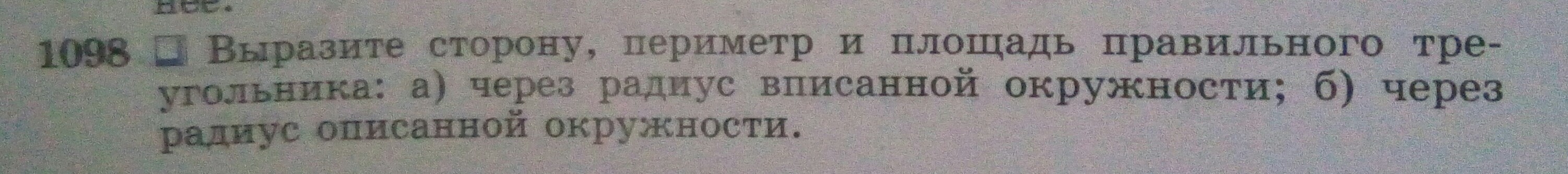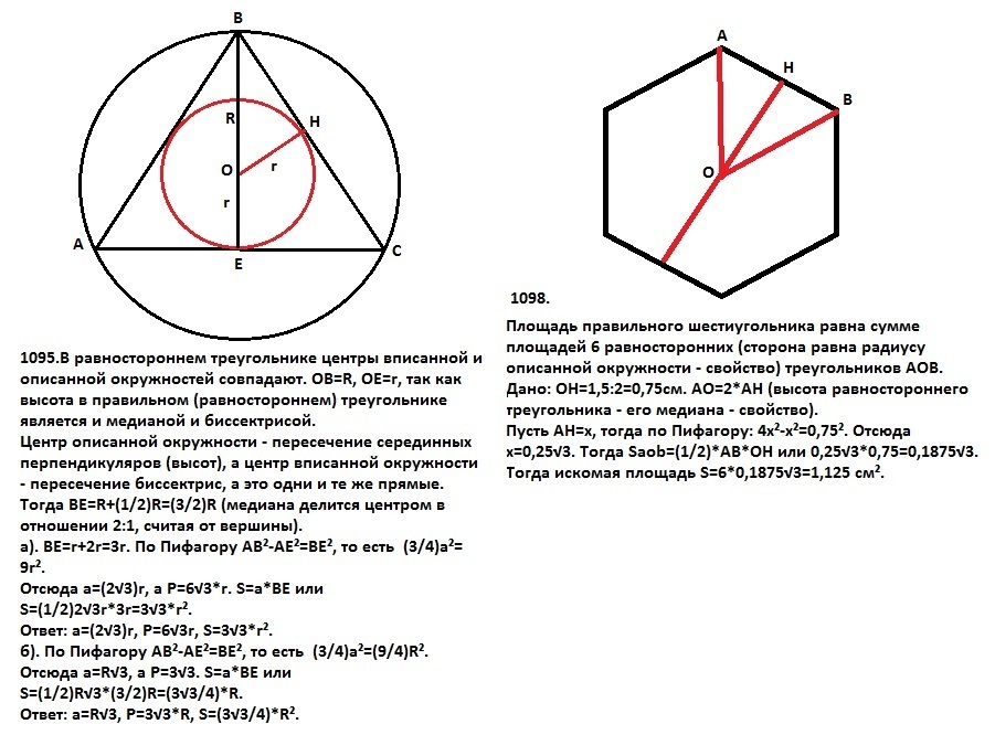 1095.В равностороннем треугольнике центры вписанной и описанной окружностей совпадают. ОВ=R, OE=r, так как высота в правильном (равностороннем) треугольнике является и медианой и биссектрисой.