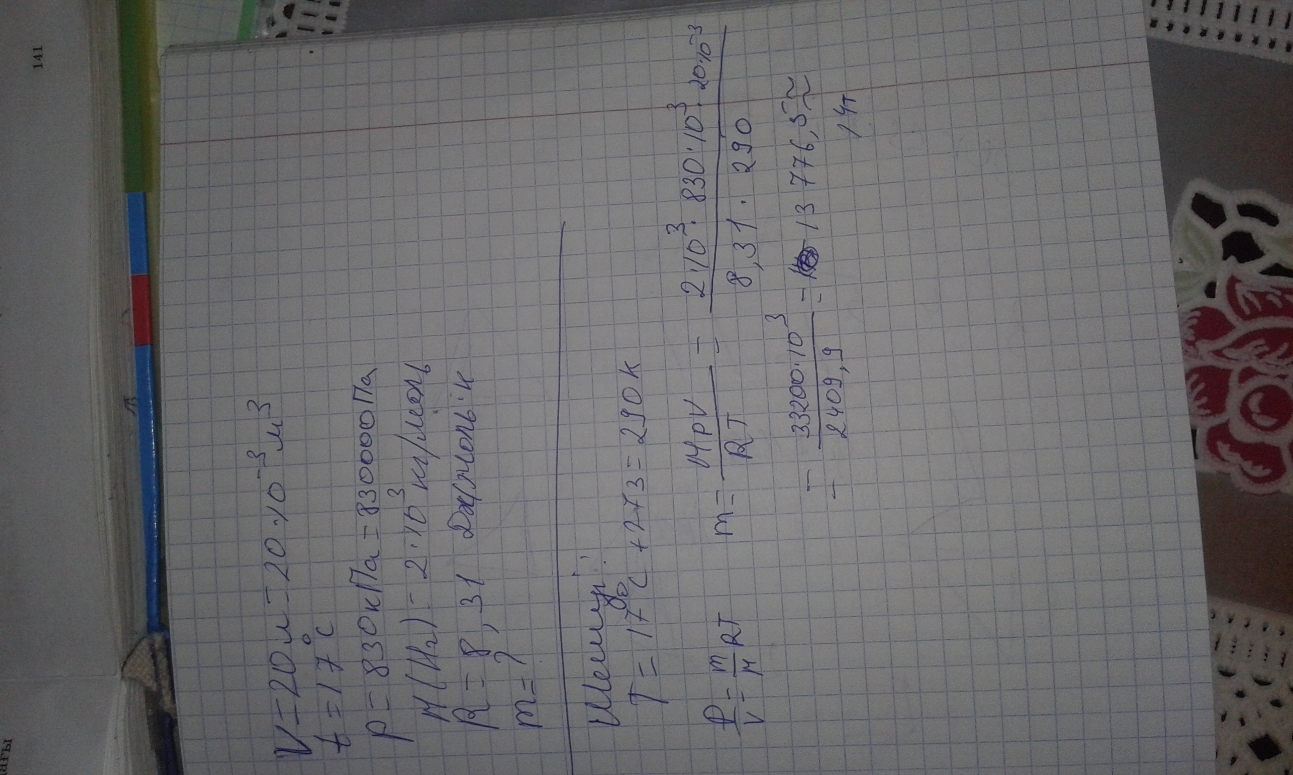 Көлемі 20л баллондағы температурасы 17°С қысымы 830кПа сутегінің массасы ( М(Н