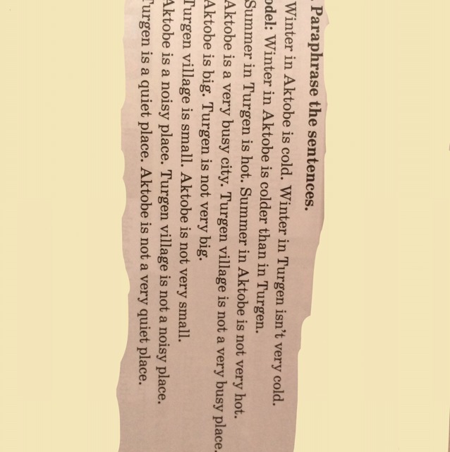 Перефразировать предложения. Зима в Актобе холодно. Зима в Тургень не очень холодно. дель: Зима в Актобе холоднее, чем в Тургень. Лето в Тургень жарко. Лето в Актобе не очень жарко. Актобе очень занят город. село Тургень не очень оживленное место Актобе большой. Тургень не очень большой. село Тургень мала. тобе не очень мало. Актобе является шумное место. село Тургень не шумное место. Юрген тихое место. Актобе не очень тихое место.