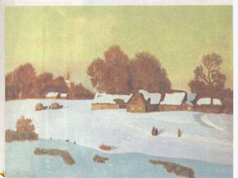 На заднем плане холста живописец изобразил зимнюю деревушку. За ней нарисован лес, состоящий из дубов или тополей. Он тёмной массой выделяется на фоне светлого, зеленовато-желтого неба. Оно низкое, чистое. По его цвету можно предположить, что закат будет розовым. Перед домиками расстилается огромное снежное пространство. Художник мастерски использует цветовую палитру для передачи различных оттенков снега: от тёмно-синих диагональных теней до чистейшего белого снега на крышах домов. Но в общем вся снежная масса кажется нежно-голубоватой. Деревня является одним из главных объектов полотна. Это небольшая группа построек, утонувших в дремучих сугробах. В окнах одного из домишек видны отблески солнца. Слева, немного в отдалении от жилых строений, виднеется купол колокольни. К одному из домов примыкает амбар. К нему направляются два воза с сеном. Перед постройками по узкой тропинке идут местные жители.
