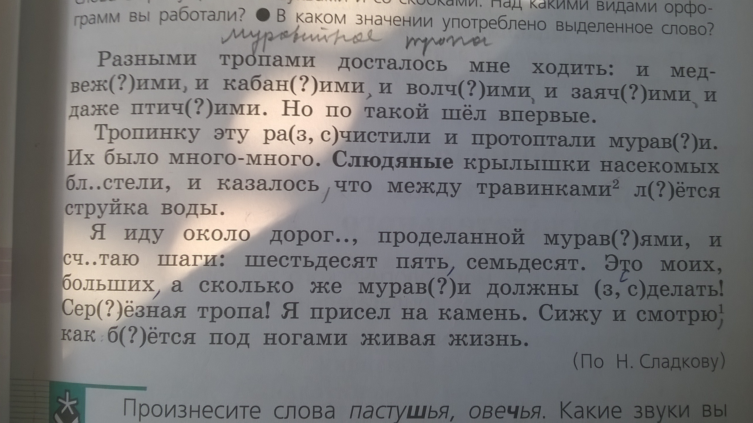 Медвеж(?)ими,кабан(?)ими,волч(?)ими,заяч(?)ими,птич(?)ими,ра(з,с)чистили,мурав(?)и,б..стели,л(?)ётся,дорог..,марав(?)ями,сч..таю,мурав(?)и,(з,с)делать,сер(?)ёзная,б(?)ётся.