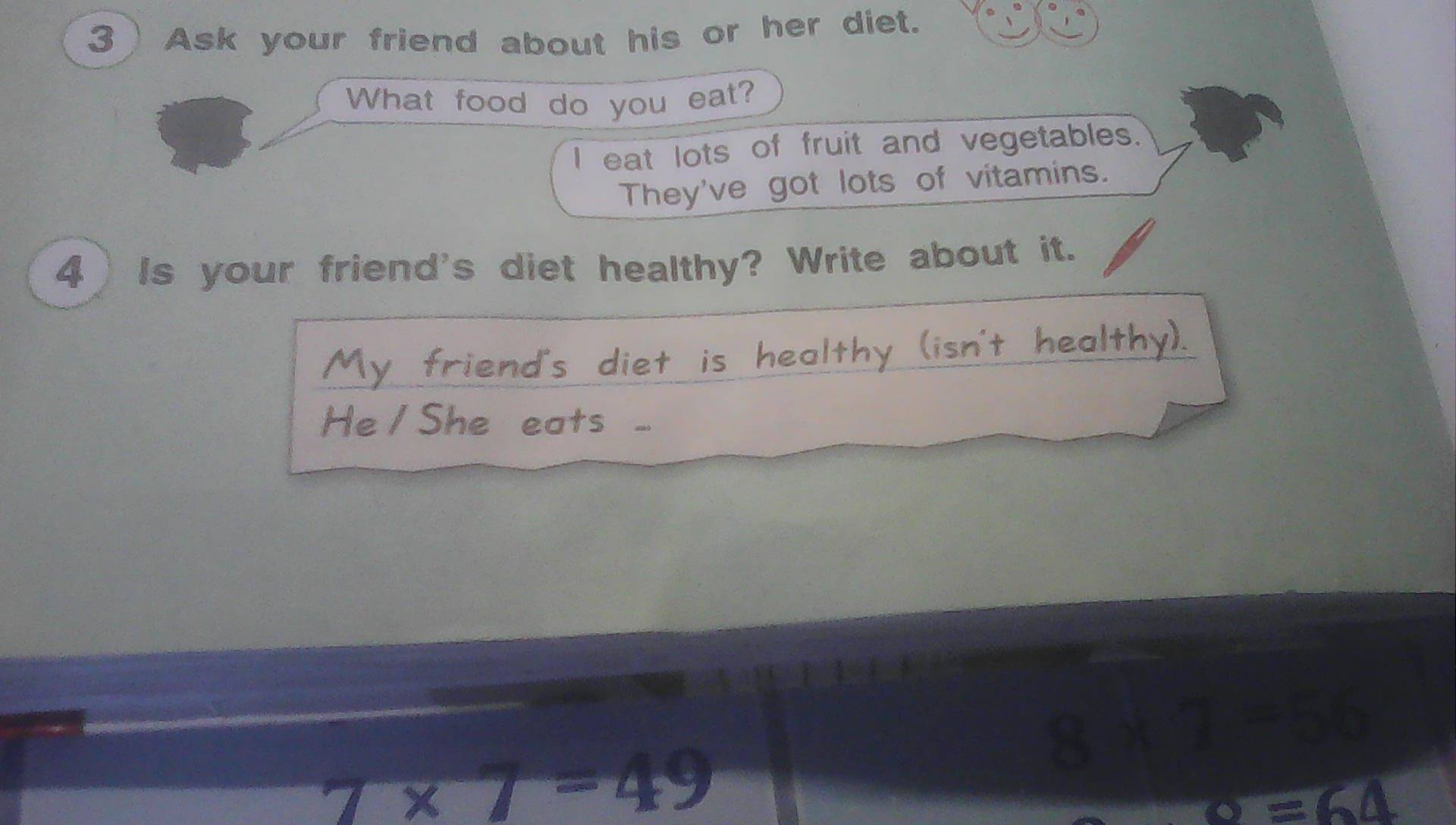 My friend's diet is healthy. She eats only healthy products like vegetables:apples, tomatoes, cucumbers, carrot, peper and many other. Although she drinks many water to have a good balance of her organism.