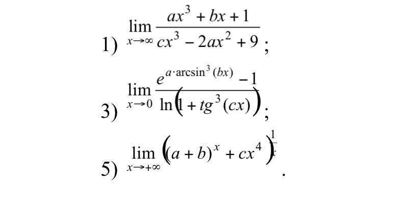 1)quad  limlimits _{x to infty}  frac{3x^3+x+1}{4x^3-6x^2+9} =  limlimits _{x to infty}frac{x^3cdot left (3+frac{1}{x^2}+frac{1}{x^3}right )}{x^3cdot left (4-frac{6}{x}+frac{9}{x^3}right )} =frac{3}{4}\\2)quad  limlimits _{x to 0} frac{e^{3arcsin^3x}-1}{ln(1+tg^3(4x))} =[; (e^{ alpha }-1)approx  alpha ; ;; ; ln( 1+alpha )approx  alpha ; ,;  alpha to 0]=\\= limlimits _{x to 0}  frac{3arcsin^3x}{tg^3(4x)} =[, arcsin alpha approx  alpha ; ,; tg alpha approx alpha ; ]=