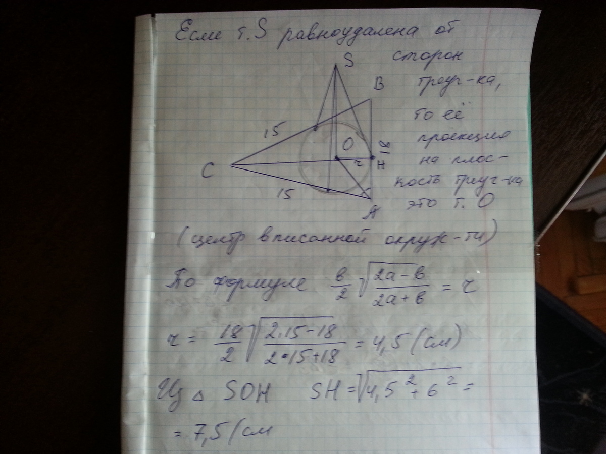 В равнобедренном треугольнике авс Ас=Вс=15,Ав=18см.Точка S удалена от плоскости треугольника на 6 см.Найдите расстояние от точки S до сторон треугольника,если s одинаково удалена от каждой из этих сторон