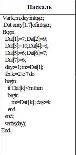В таблице Dat хранятся данные измерений среднесуточной температуры за неделю в градусах (Dat[1] – данные за понедельник, Dat[2] – за вторник и т.д.).