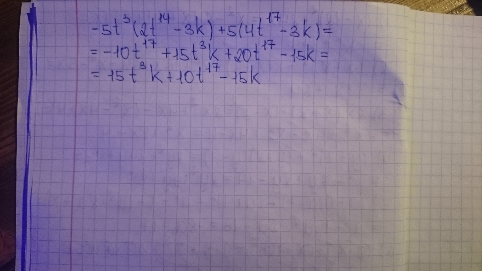 Упрости выражение −5t^3(2t^14−3k)+5(4t^17−3k)
