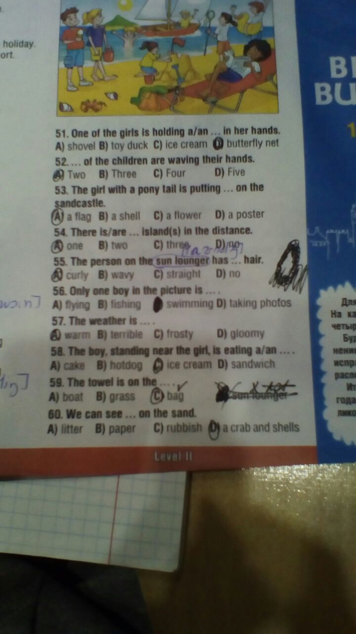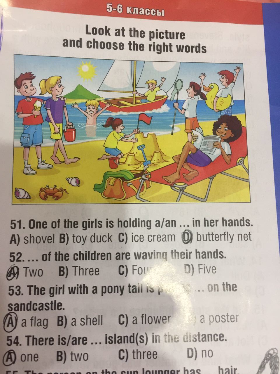Все верно за исключением 52. Предложение переводится "... детей машут руками". По рисунку видно, что машут трое (и еще один в воде, но думаю; что его считать не нужно). Получается, что ответ не А, а В. (если считать того, что в воде, тогда С)