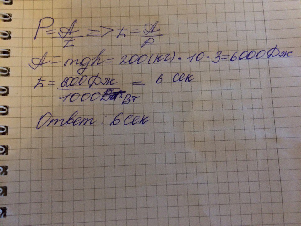 Определите время равномерного подъёма груза m=200 кг механизмом,мощность которого P=1,0 кВт,на высоту h=3,0 м. Коэффициент g принять равным 10 Н на Кг.