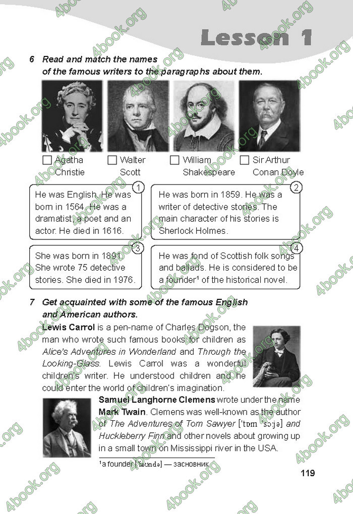 Lewis Camol это псевдоним Чарльза Догсона, человека, который написал такие известные книги для детей, как Алиса в Стране Чудес и Алиса в Зазеркалье. Lewis Camol был замечательным детским писателем. Он понимал детей и он мог войти в мир детской фантазии. Samuel Langhorne Clemens писал под именем Марк Твен Клеменс был хорошо известен как автор Приключений Тома Сойера и Гекльберри Финна и многих других романов о проживании в маленьком городке на реке Миссисипи в США.