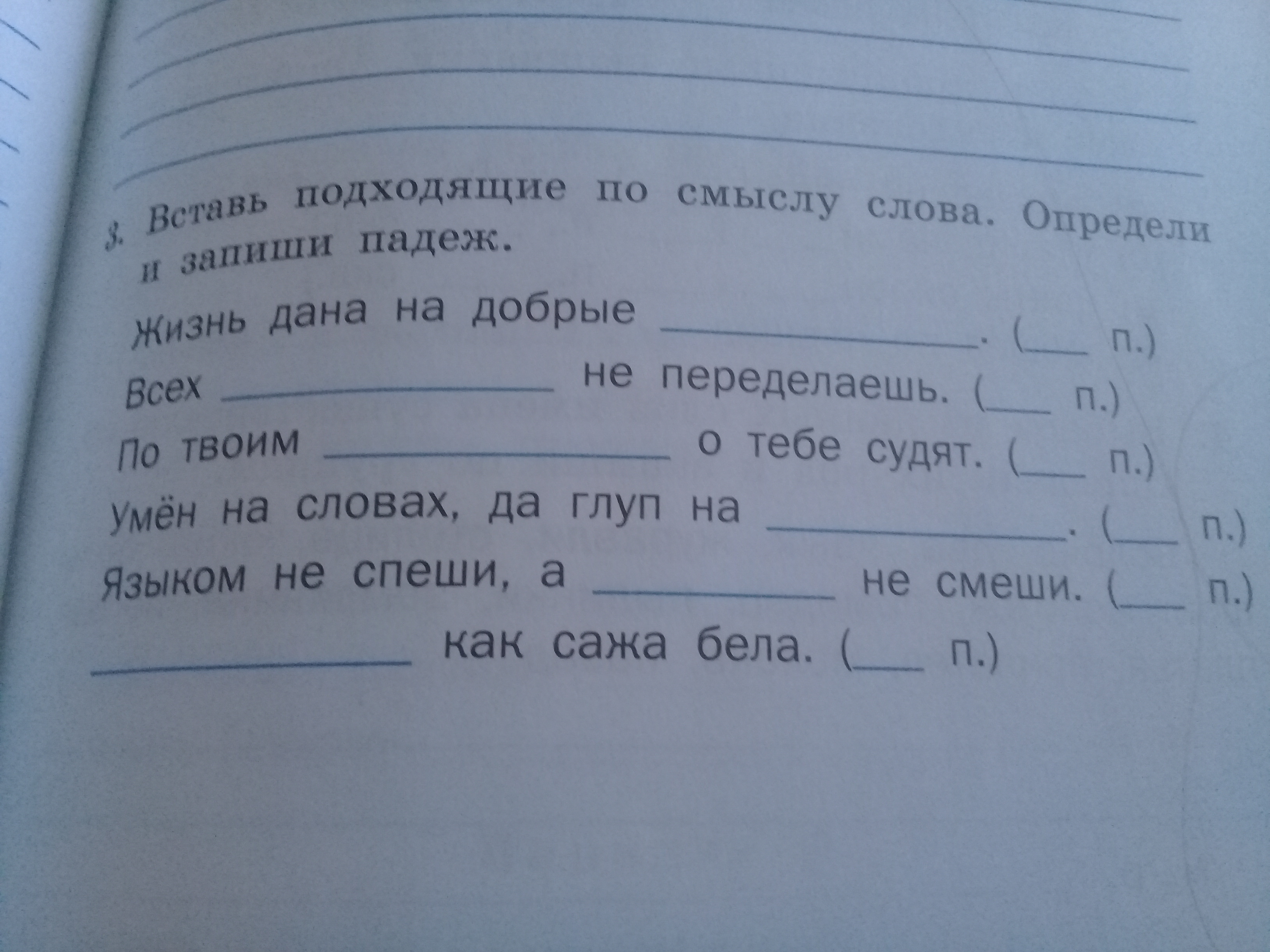 Вставь подходящие по смыслу слова.Определи и запиши падеж.