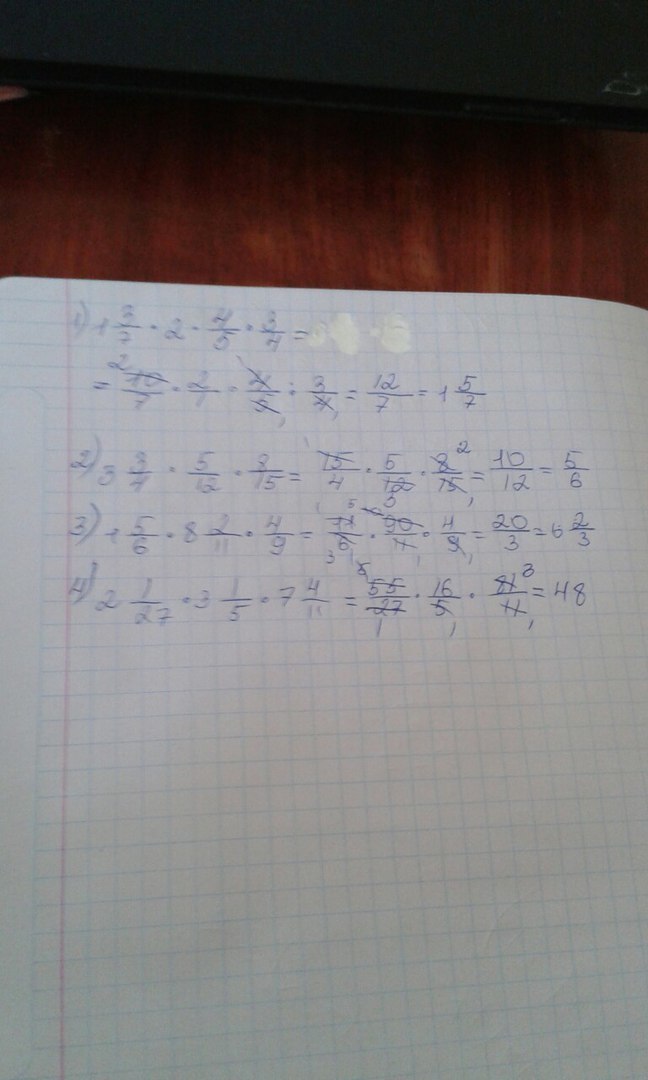 выполните умножение 1 целая 3/7*2*4/5*3/4 3 целых 3/4*5/12*8/15 1 целая 5/6*8 целых 2/11*4/9 2 целых 1/27*3 целых 1/5*7 целых 4/11 только с решением и правильным дам 10 балл мне сегодня очень срочно нужно помогите добрые люди