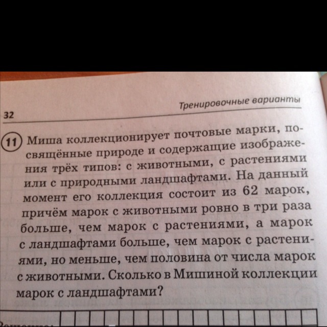 Т.к. марки целочислены, выходит, что марок с растениями было 12 штук, следовательно, марок с животными 3 * 12 = 36 штук, а марок с ландшафтами 62 - 36 - 12 = 14 штук.