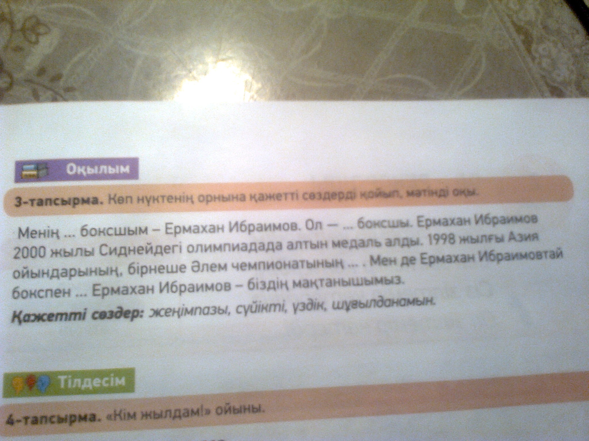 Мой любимый боксёр- Ermahan Ибраимов. Он самый лучший боксер .Ermaxan Ибраимов олимпийская медаль в Сиднее в 2000 году. 1998 Азиатских игр, победитель Кубка мира. Я тоже как Ермахан Ibrayimov занимаюсь боксом. Ермахан Ibrayimov наша гордость