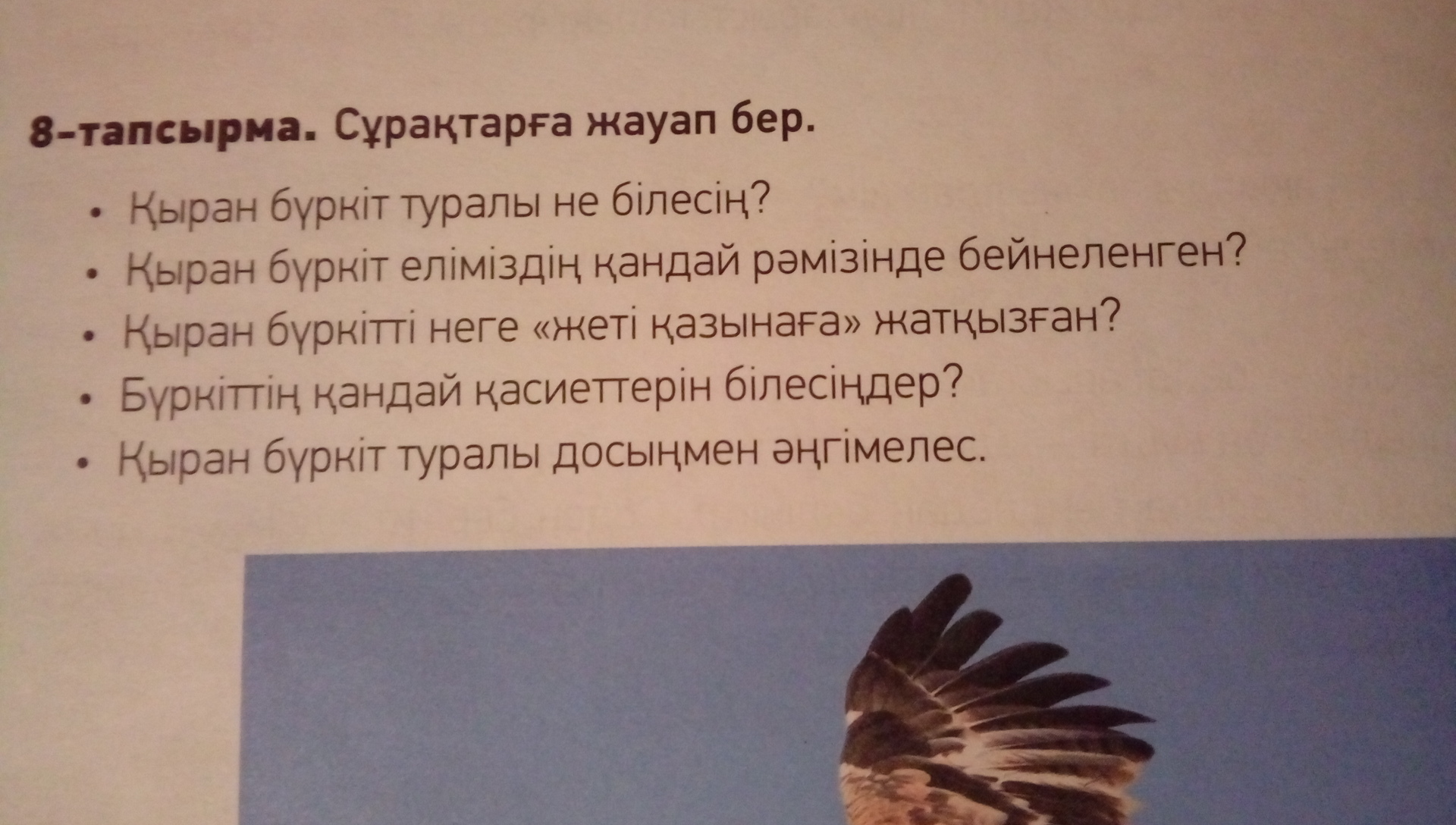 5.Қыран буркіт ол ең киелі,адемі құс. Ол біздін Туымызда бейнеленген.Буркіт ол бейбітшіліктің белгісі болып саналады.