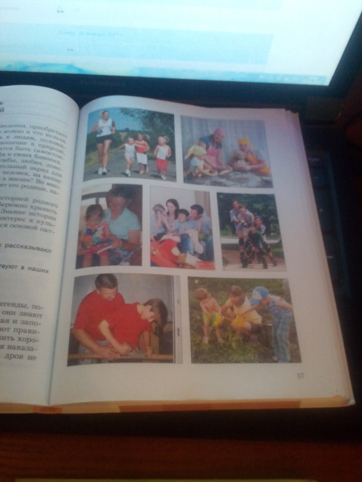 на странице 57 мы можем увидеть люди проводят время вместе. исходя из того что они делают мы можем предположить, что это семья. Скорее всего фотографии нам говорят о том что у семей есть такие традиции как времяпровождение вместе. Например: катание на роликах, готовка,занятия спортом и т.д.