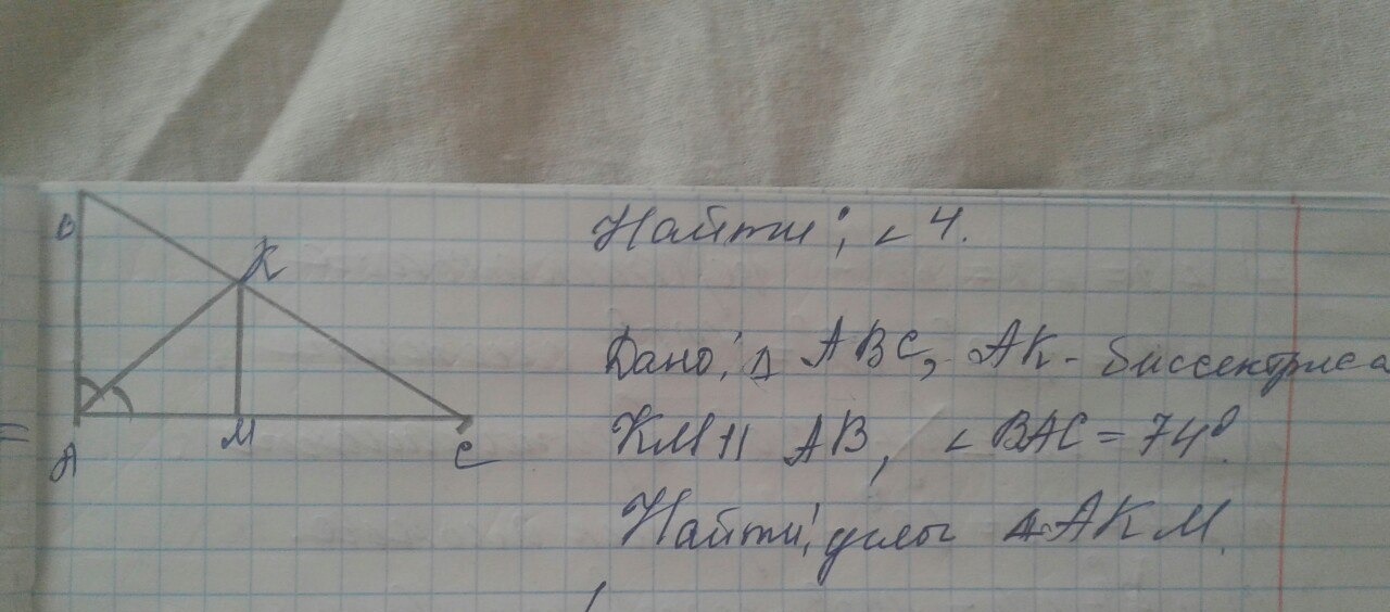 Угол КАМ=углу ВАК=74:2=37 - так как АК - биссектриса.