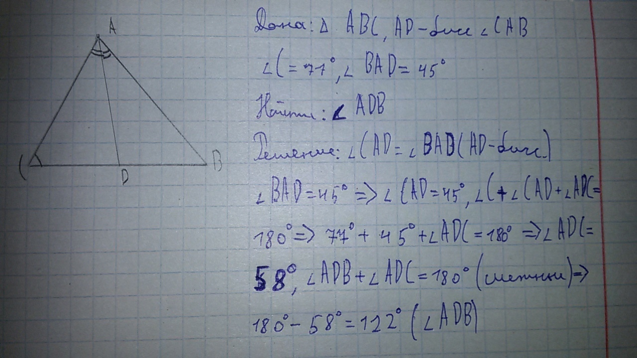 В треугольнике АВС угол С=77 градусов, АД биссектриса, угол BAD равен 45 градусов. Найдите угол ADB.
