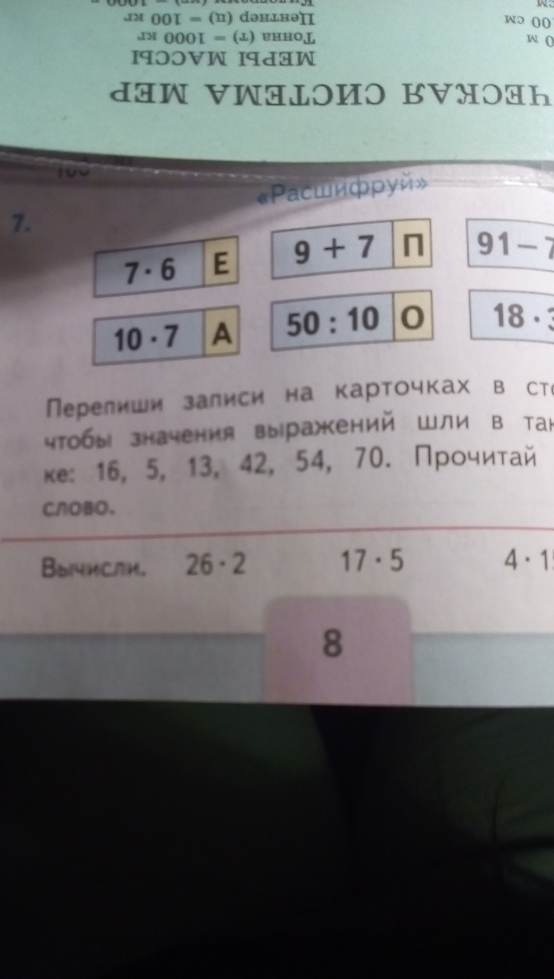 перепиши записи на карточках в столбик так чтобы значения выражений шли таком порядке: 16,5,13,42,54,70. Прочитай полученное слово. Номер 7