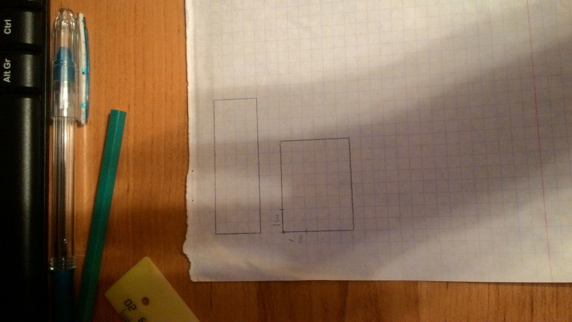 Я, может, сейчас секрет тебе открою, но если 1 см - это 2 клетки, то прямоугольник будет содержать 24 клетки в себе. просто построй 2 таких прямоугольника, просто разной формы.