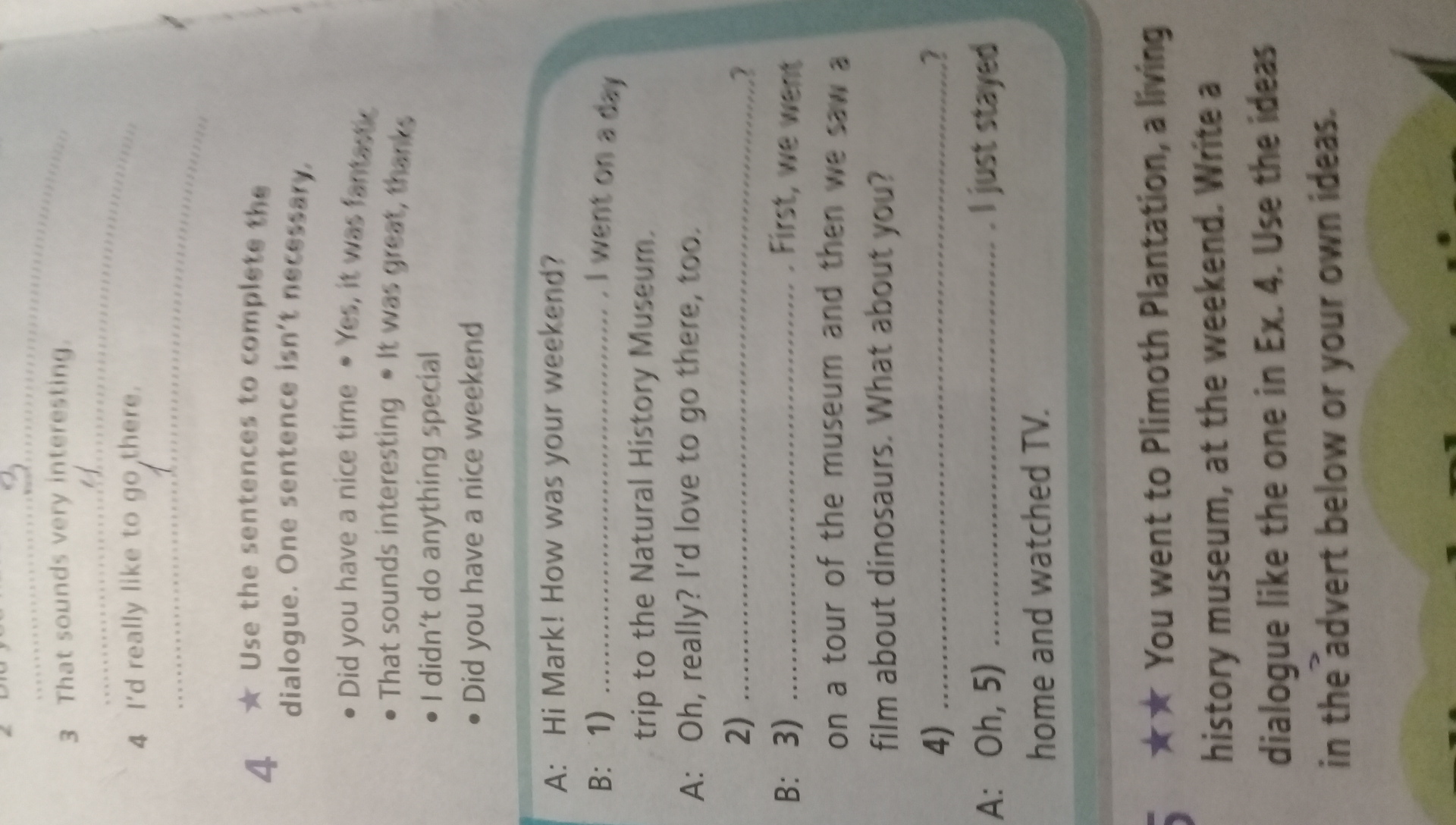 1) it was great, thanks. 2). Did you have a nice weekend? 3) yes, it was fantastic. 4) that sounds interesting. Did you have a nice time? 5) i didn't do anything special.