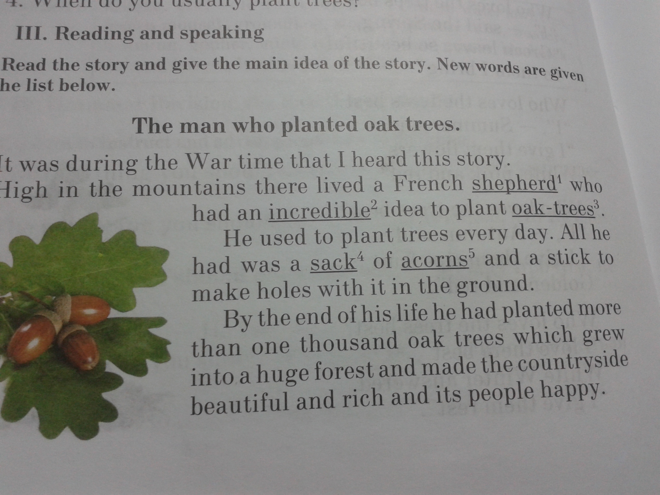 Мужчина, который посадил дубы. Это было "военное время", я слышал эту историю. Высоко в горах, жил французский пастух, который задумал потрясающую идею посадить дубы. Он сажал деревья каждый день. Он собирал желуди в мешок и втыкал их в отверстия в земле. Настал конец его жизни, он насажал много деревьев, тысячи, из которых вырос огромный сад, и деревня, в которой были дубы, была прекрасна, богата и люди там были счастливы.