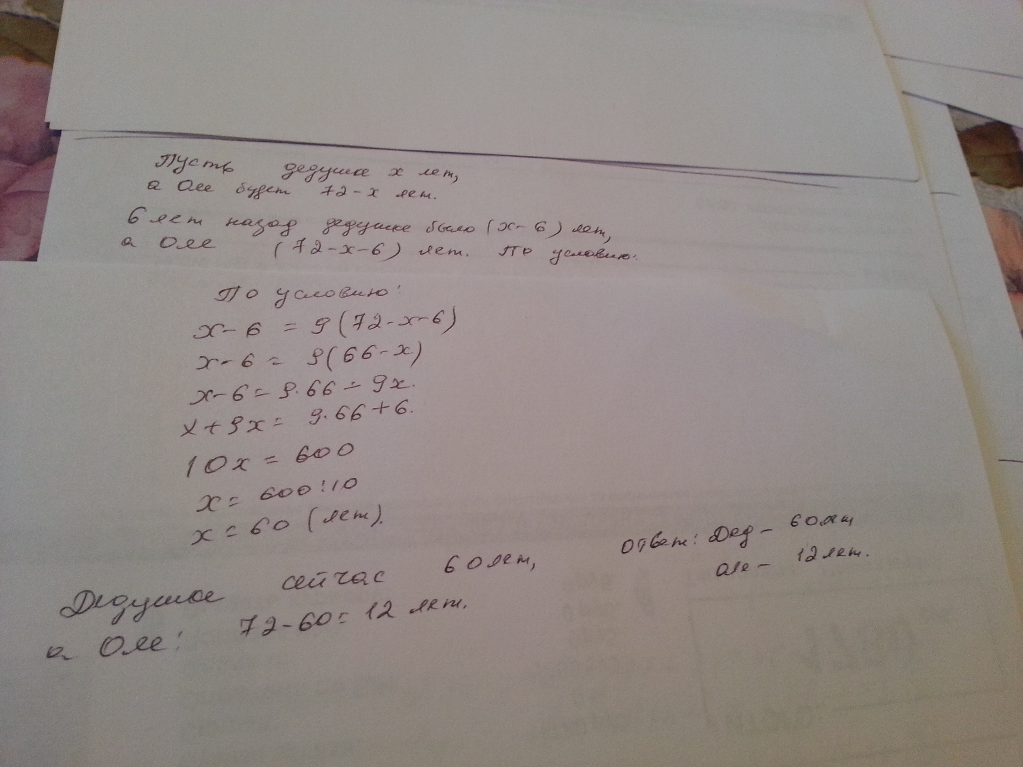 Дедушке и Оле вместе 72 года, а 6 лет назад дедушка был в 9 раз старше Оли. Сколько лет им сейчас?