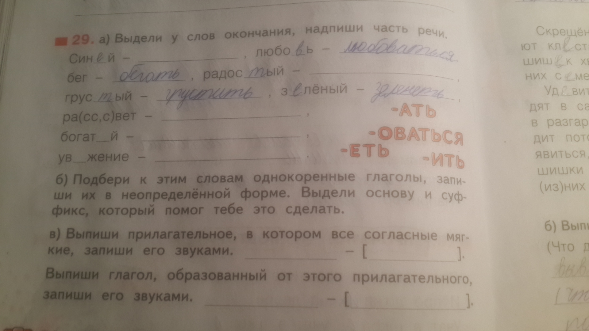 синий окончание [ий] ( квадратом делаешь) часть речи прилагательное, в слове любовь нет окончания пустой квадрат нарисуй в конце. часть речи имя существительное,бег тоже смамое только часть речи глагол. радостный окончание ый часть речи имя прилагательное, грустный оконание ый имя прилаг, зеленый окончание ый прилаг,рассвет нулевое окончание глагол, богатый окончание ый имя прилагательное, уважение имя существительное окончание ие. основа это вся часть кроме окончания, суффикс ^ например любоваться суффикс ать. если что непонятно пиши