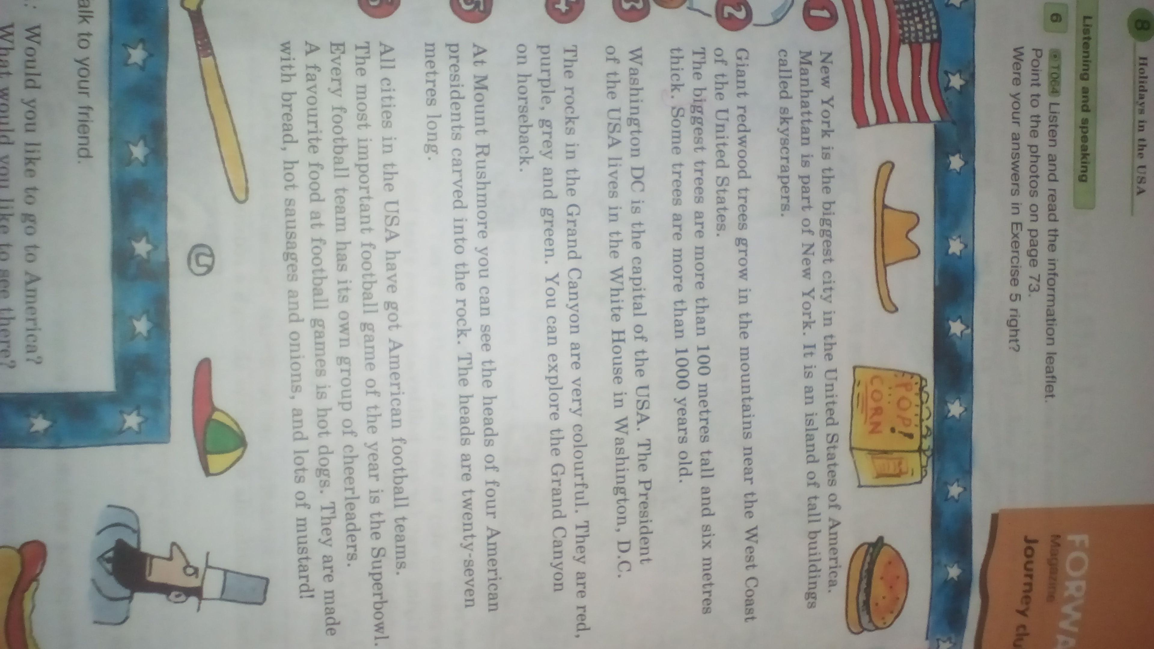 Нью-Йорк является самым крупным городом в Соединенных Штатах Америки. Манхэттен является частью Нью-Йорк. Это островок высокой buildinga называется yncra Пера. Гигантские красное дерево деревья растут в горах недалеко от западного побережья Соединенных Штатов. метров Самые большие деревья, чем 100 и шесть Некоторые из них более 1000 лет. DC является столицей США. Президент США живет в Белом доме в Вашингтоне. D.C. Скалы в Гранд-Каньон очень красочным. Они являются красный, фиолетовый, серый и зеленый. Вы можете изучить Гранд-Каньон на лошадях. На горе Рашмор вы ЕАН увидеть главами четырех американских президентов высеченных в скале. Главы длиной двадцать семь метров. Все города в США получили американские футбольные команды. Самый важный футбольный матч года является футбольная команда суперкубок Каждый имеет свою собственную группу чирлидеров. Излюбленная еда на футбольных игр хот-доги. Они сделаны с хлебом, горячими сосисками и луком, а также большим количеством горчицы
