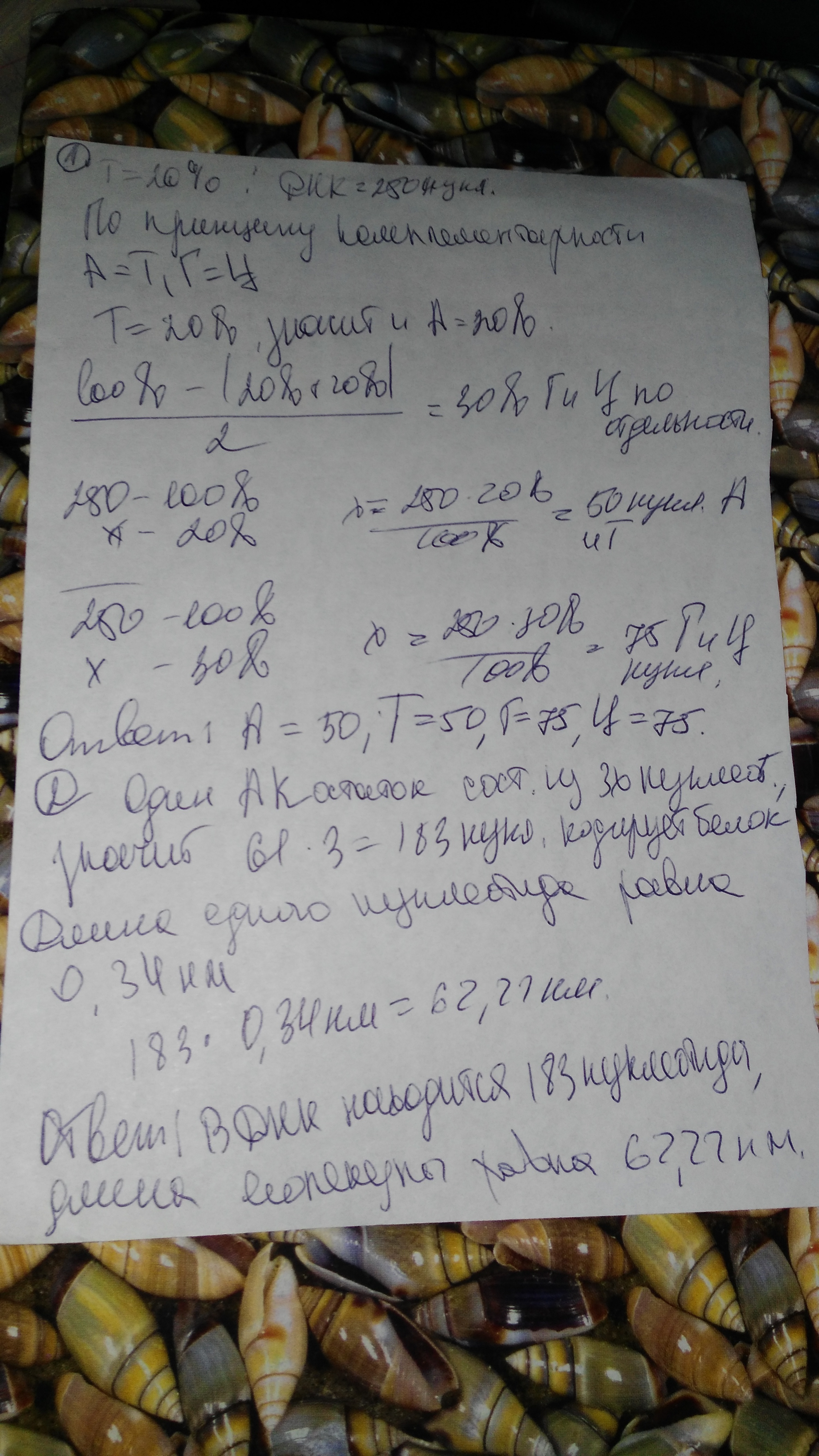 1. Всего - 250 нуклеотидов. Мы знаем, что ДНК состоит из 4х нуклеотидов: А - аденин, Т - тимин, Ц-цитозин и Г - гуанин. Причем, Аденин комплементарен Тимину, а Гуанин комплементарен Цитозину.