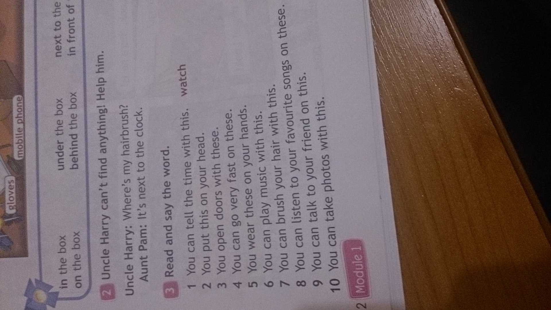 Прочитать и произнести слово.1 Вы можете сказать время с этим. смотреть2 Вы положить это на свою голову.3 Вы открывать двери с этими.4 Вы можете пойти очень быстро на них.5 вы носите их на руках.6 Вы можете играть музыку с этим.7 Вы можете чистить волосы с помощью этого.8 Вы можете слушать ваши любимые песни на эти9 Вы можете поговорить с вашим другом об этом.10 Вы можете взять фотографии с этого.