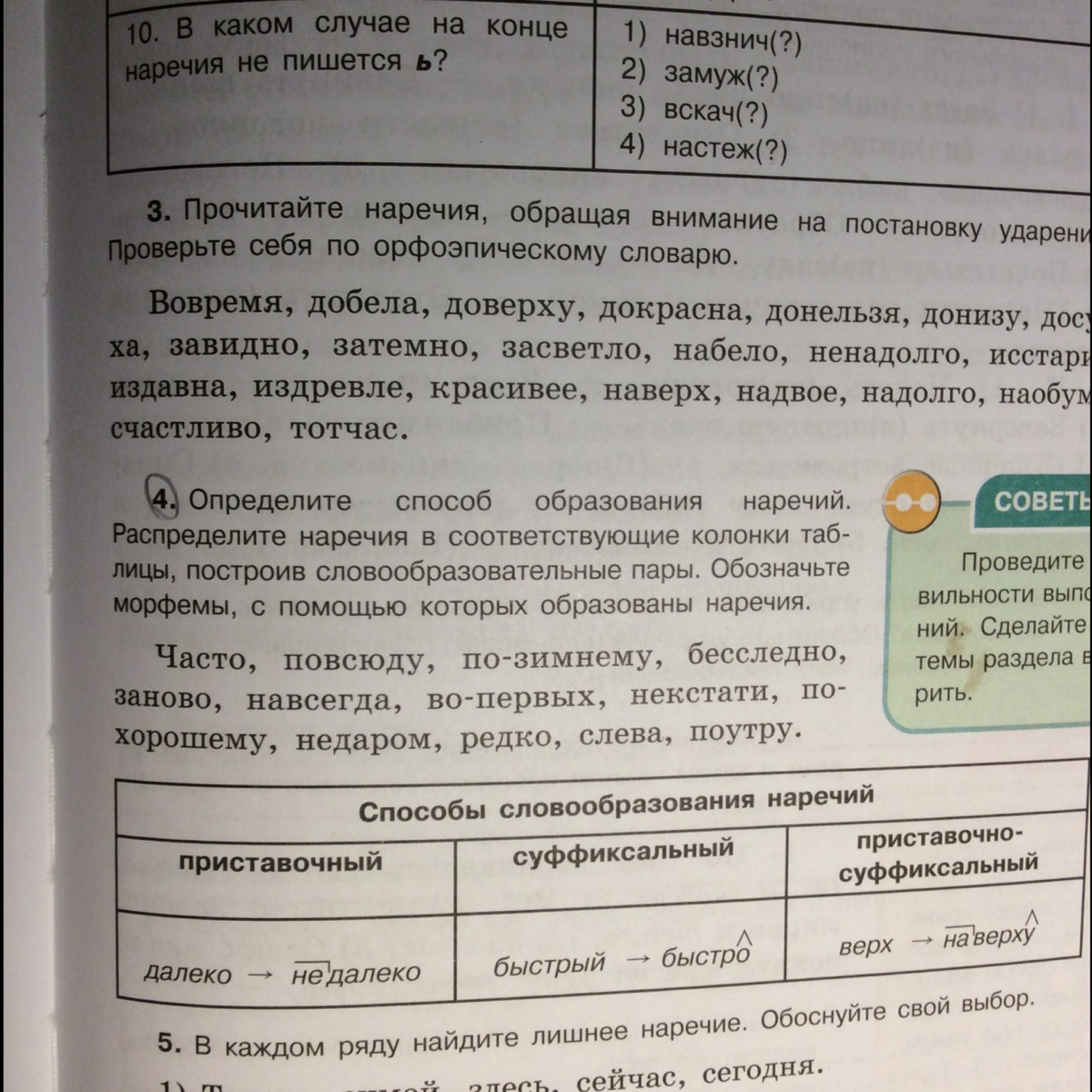 Определите способ образования наречий. Распределите наречия в соответствующие колонки таблицы, повторив словообразовательные пары. Обозначьте морфемы, с помощью которых образованы наречия.