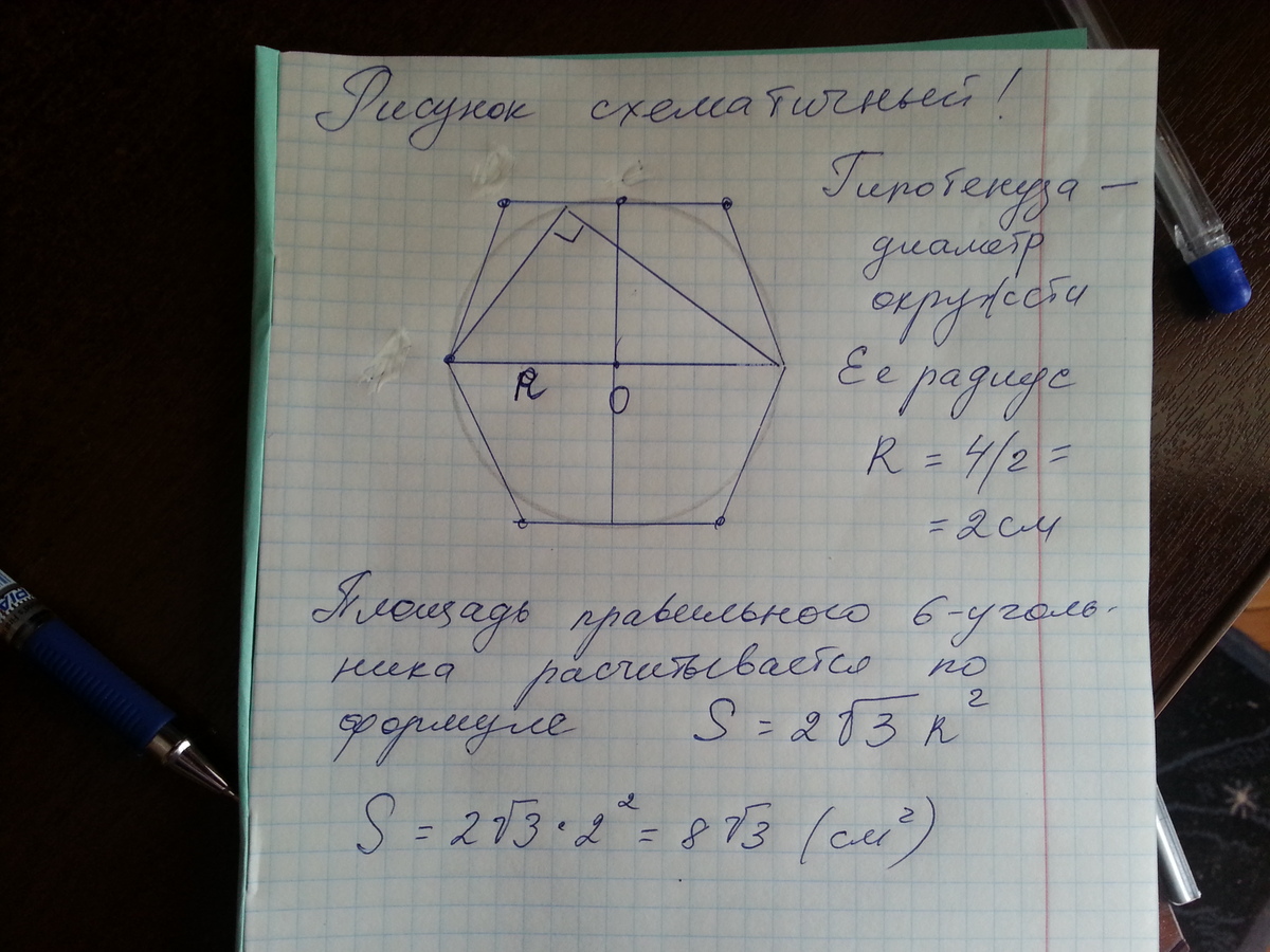Прямоугольный треугольник с гипотенузой 4 см вписан в окружность. Найдите площадь правильного шестиугольника, описанного около данной окружности. Помогите пожалуйста. Спасибо за решение,но помоему вы решили задачу для вписанного многоугольника. а мне нужно для описанного