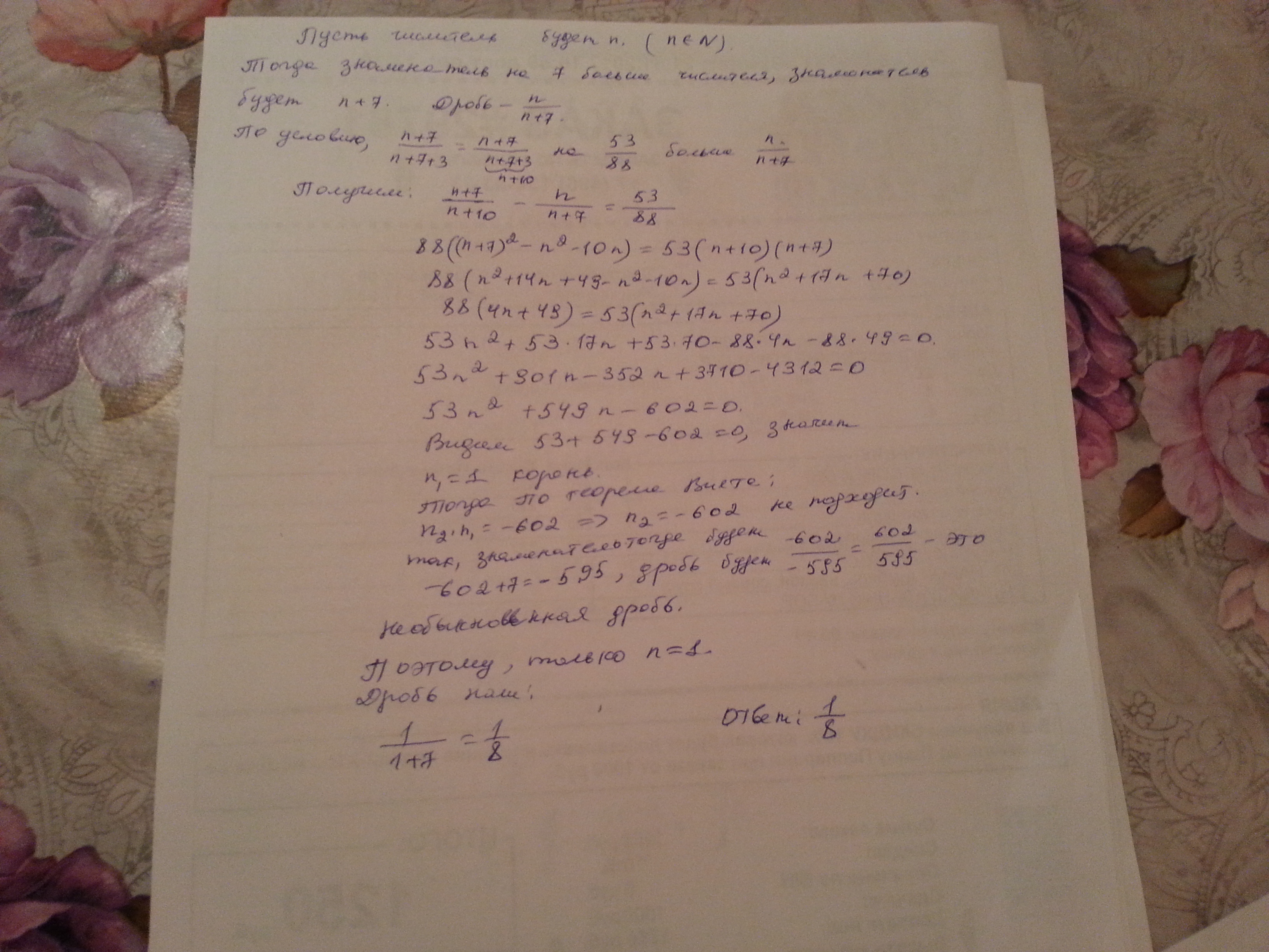 Числитель обыкновенной дроби на 7 меньше знаменателя. Если к числителю прибавить 7, а к знаменателю 3,то данная дробь увеличивается на 53/88. Найдите первоначальную дробь