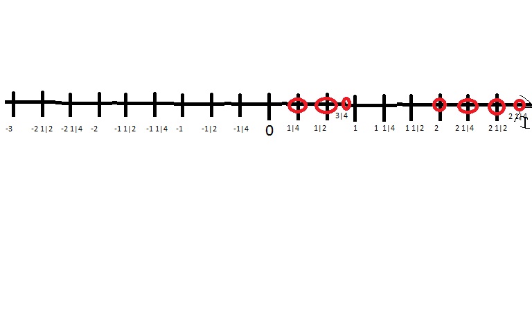 Выберете один единичный отрезок и отметьте на координатном луче точки: 0, 1/4, 1/2, 3/4, 2, 2 1/4,2 1/2, 2 3/4
