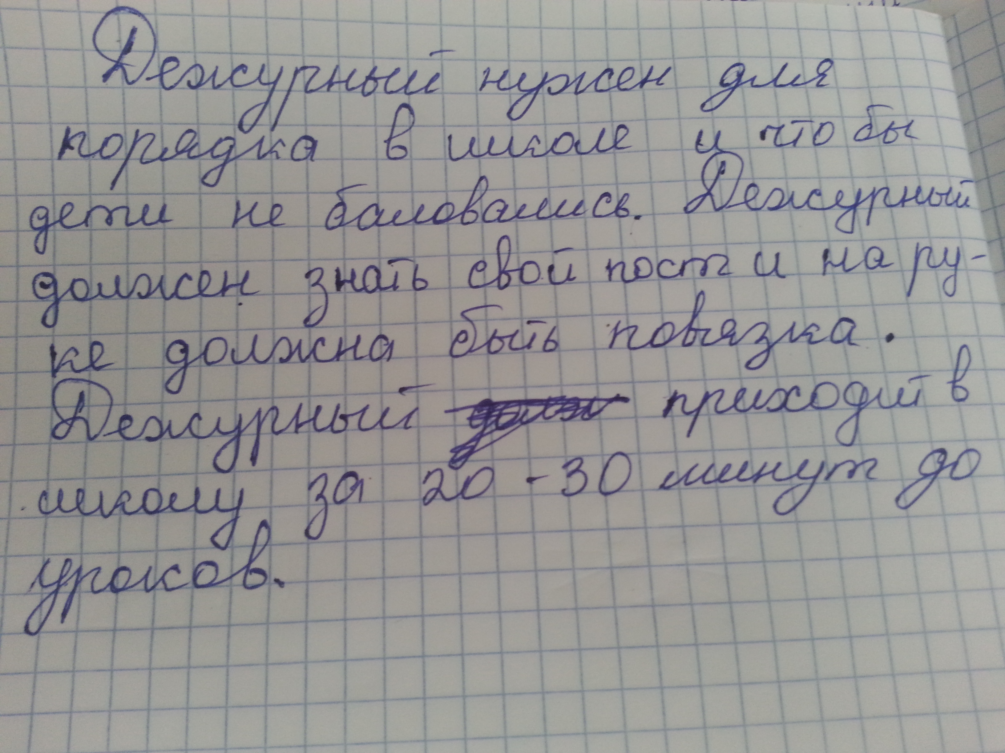 Кезекші мектепте тазалық сақтау үшін және де оқушылар бузақылық жасамас үшін керек. Кезекші өзінің ұстанымын біліп, қолына таңу тағып жүру керек. Кезекші мектепке 20-30 минутқа ерте келуі керек.