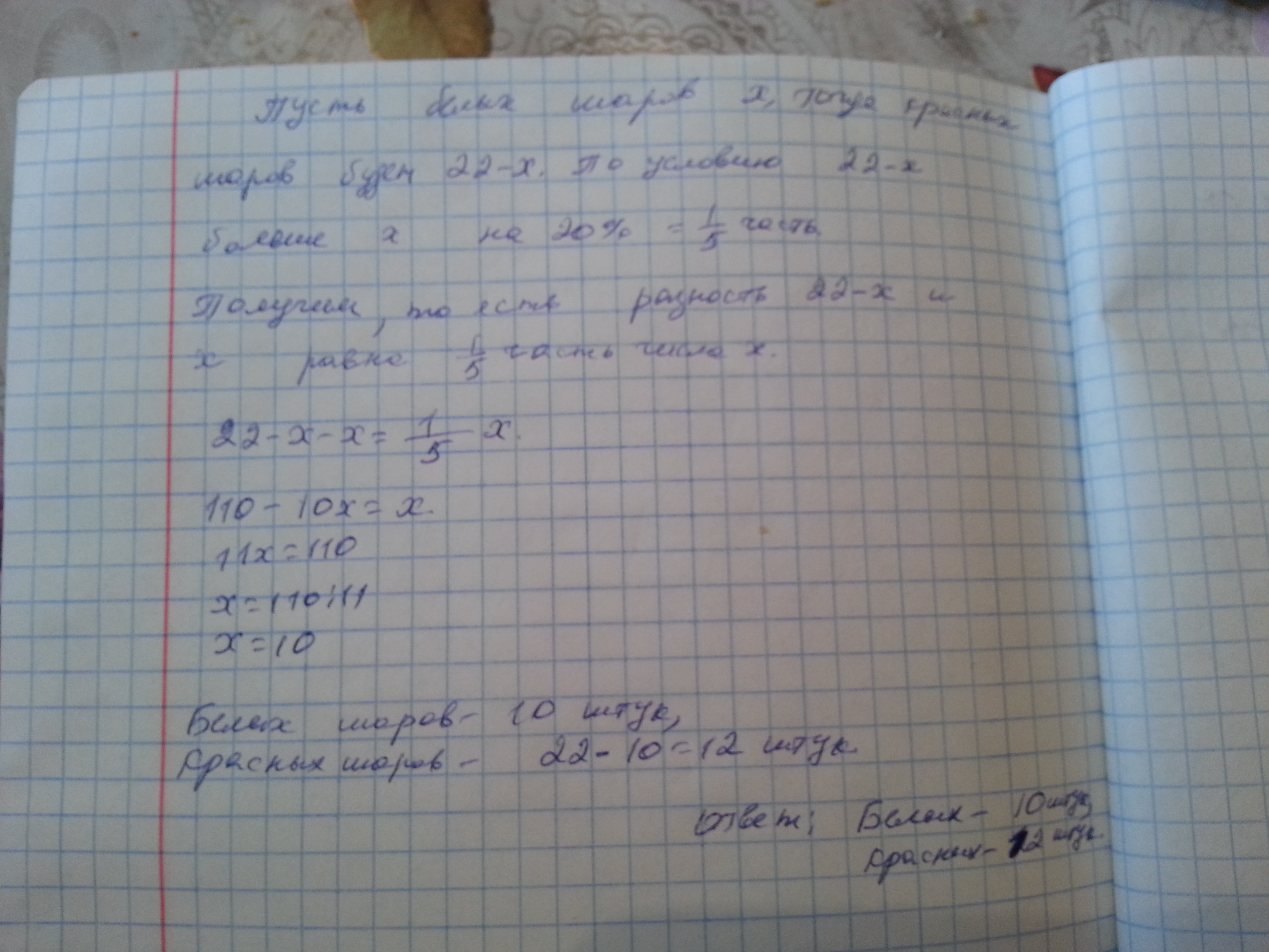 Количество красных шаров в урна на 20% больше чем кол-во белых шаров всего шаров 22 сколько красных и белых шаров в урне?