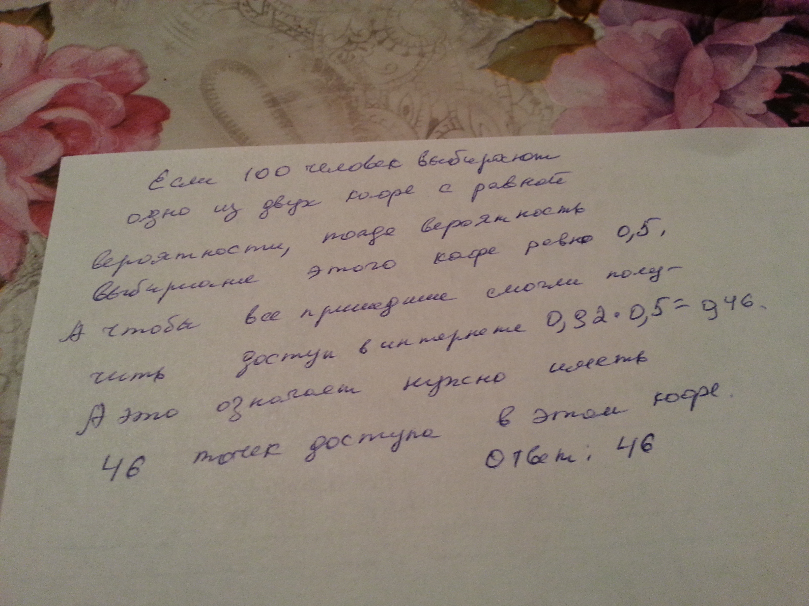 Ежедневно 100 жителей посещают интернет-кафе, выбирая одно из двух с равной вероятностью и независимо друг от друга. Владелец одного из них желает, чтобы с вероятностью 0,92 все пришедшие в интернет-кафе смогли одновременно получить доступ в интернет. Сколько точек доступа должно быть для этого в его интернет-кафе?