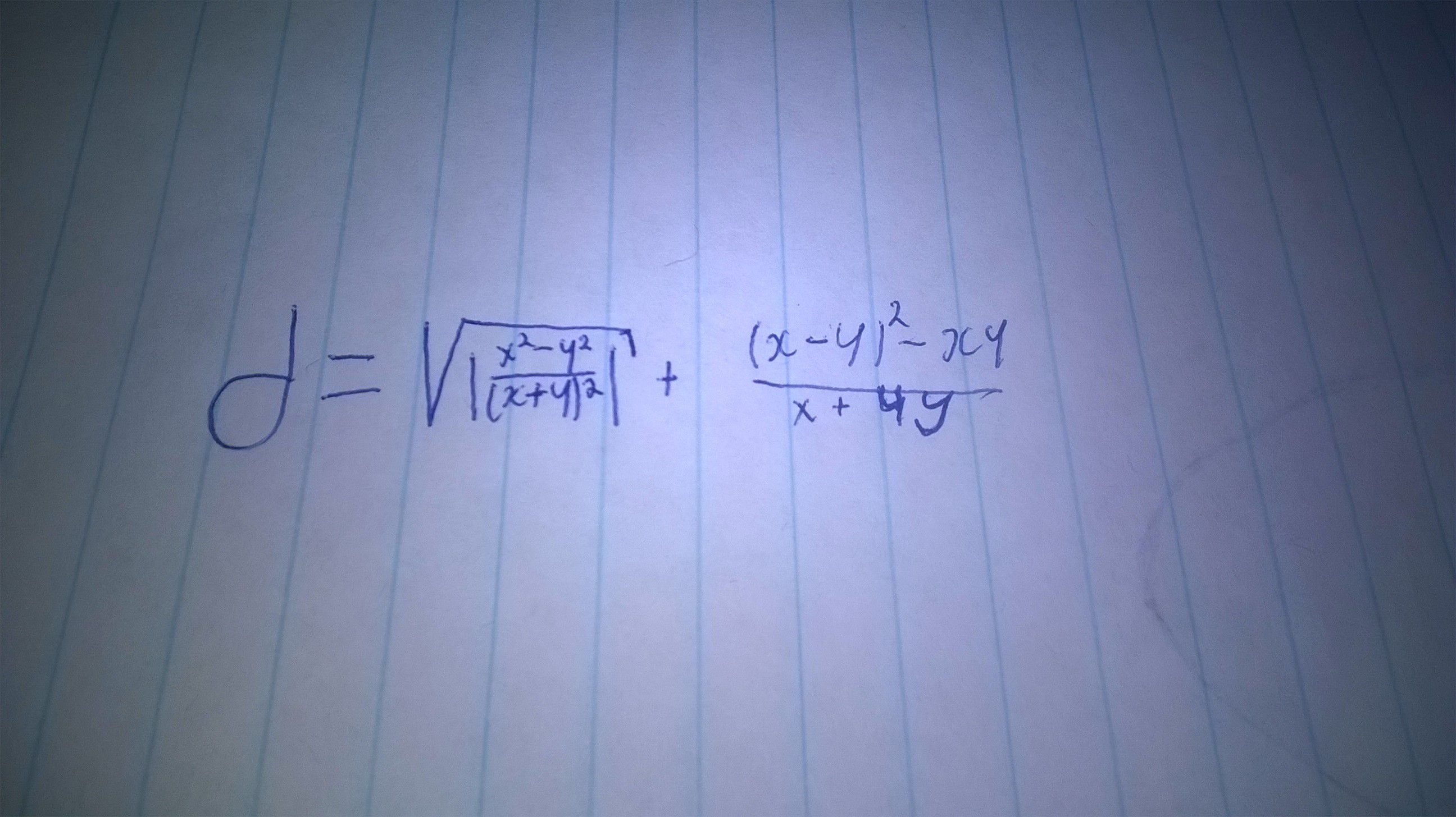 d:=(sqrt(abs((sqr(x)-sqr(y))/sqr(x+y)))+((sqr(x-y)-x*y)/x+4*y)