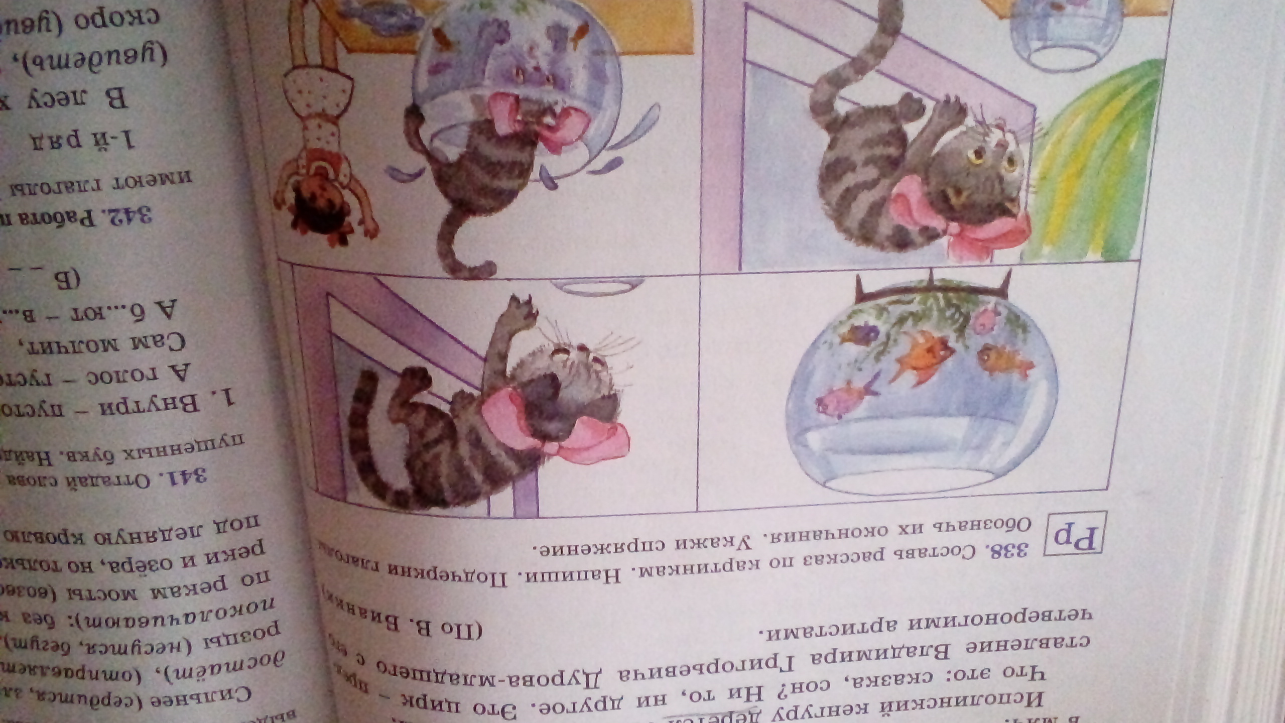 стоял аквариум. Но потом пришел кот.Увидел аквариум и упал в него. Когда пришла девочка увидела кота в аквариуме и вытащила его.