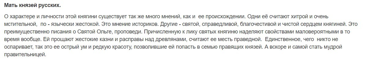 Блестящую оценку правлению Ольги дал историк Н.М. Карамзин. Он писал, что она "мудрым правлением доказала, что слабая жена может иногда равняться с великими мужами".