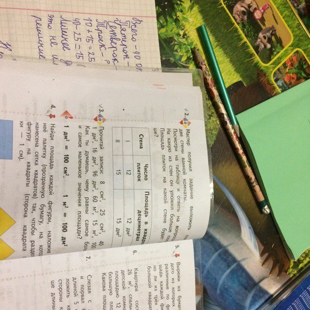 Мастер получил задание выложить плитками две стены ванной комнаты.посмотри на таблицу и ответь на вопросы.на какую из стен он уложил больше плиток?площадь плиток на какой стене будет больше? помогите с решением . понятно что на вторую стену больше вот как это записать ?