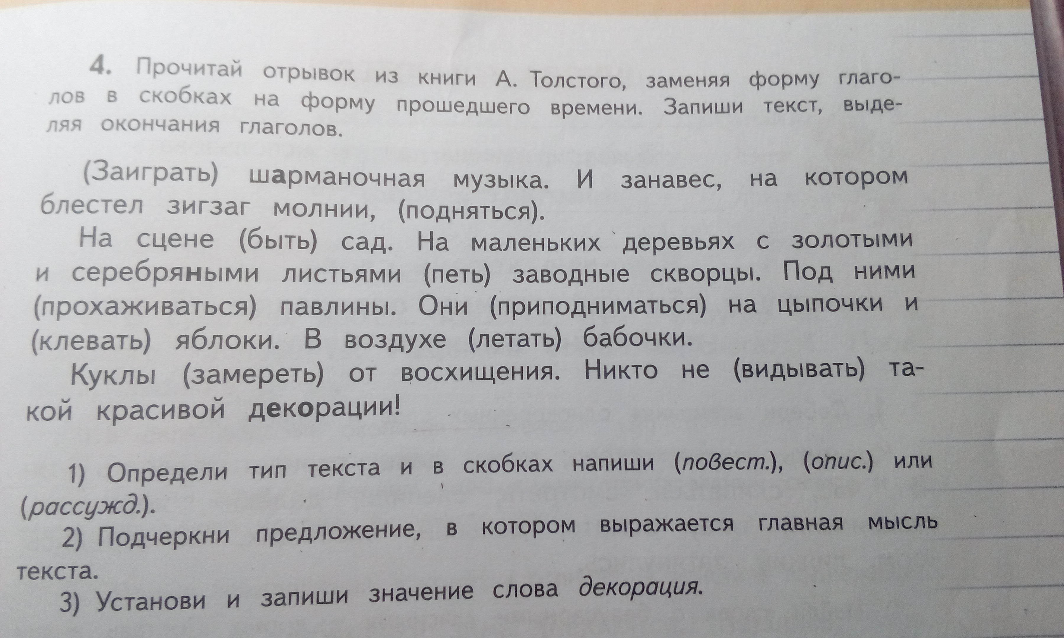 Прочитай отрывок из книги А. Толстого, заменяя форму глаголов в скобках на форму прошедшего времени. Запиши текст, выделяя окончания глаголов.