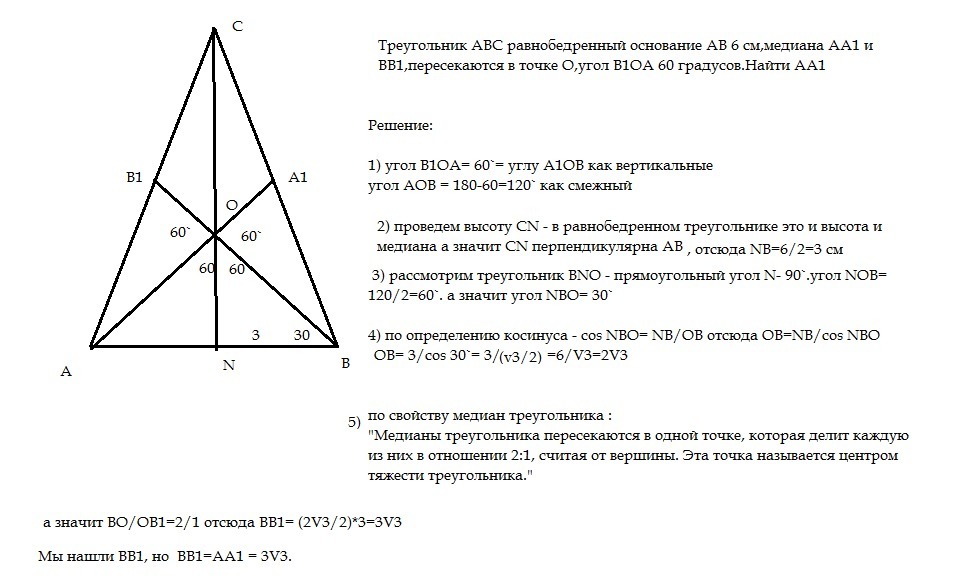 Треугольник ABC равнобедренный основание AB 6 см,медиана AA1 и BB1,пересекаются в точке O,угол B1OA 60 градусов.Найти AA1